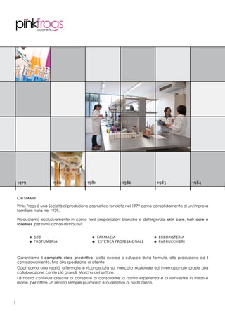 Pinks Frogs è un'azienda cosmetica fondata nel 1979, specializzata nella produzione in conto terzi di cosmetici, skin care e hair care, supportando i clienti dall'ideazione del prodotto fino alla spedizione. L'azienda si impegna per la sostenibilità e la qualità, creando formulazioni rispettose dell'ambiente e offrendo una vasta gamma di prodotti innovativi. La competenza del personale e la continua ricerca di miglioramento garantiscono un servizio di alta qualità e l'efficacia delle soluzioni proposte.
