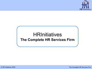 HR Initiatives is an HR consulting firm that provides innovative HR solutions. Its vision is to continually exceed customer expectations and its mission is to use cutting edge technologies and HR best practices. The company offers HR consulting, outsourcing, and training and development services to help clients build competencies and implement solutions. It has experience across industries and educational backgrounds to serve clients nationwide.