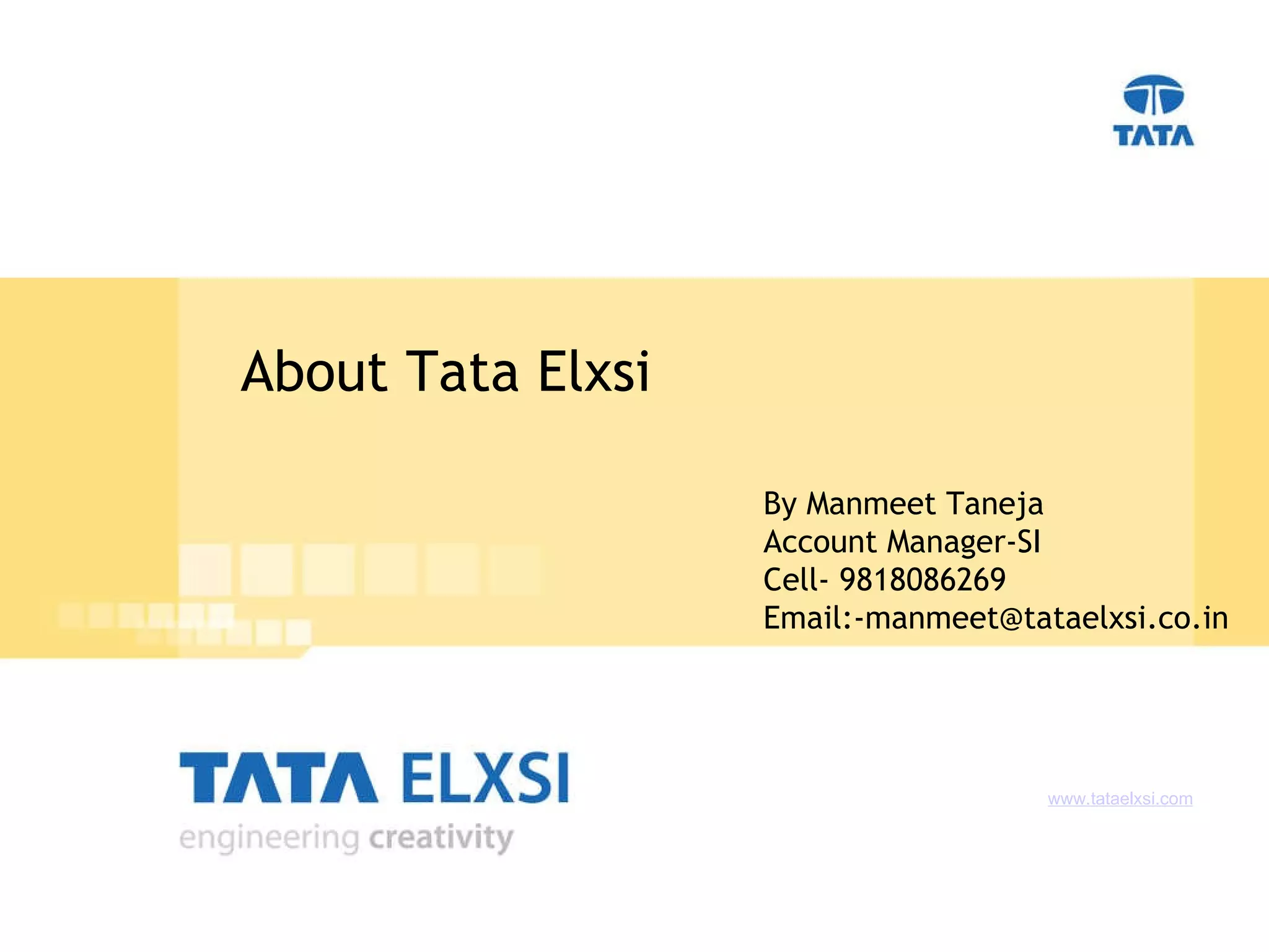 Tata Elxsi is a technology company that is part of the Tata Group, one of India's largest conglomerates. It has over 2,000 employees located across several offices in India as well as internationally. Tata Elxsi provides services such as systems integration, product design, visual computing, and enterprise IT solutions to a wide range of customers in industries like automotive, aerospace, engineering, media, and consumer products. It aims to be a one-stop-shop for its customers' technology needs by offering customized solutions and flexibility.