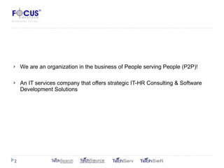 Future Focus Infotech Private Limited, established in August 2010, specializes in IT-HR consulting and software development, operating in India and the USA with 1250 employees and $12 million in revenue. The company aims to be a leading IT consulting organization, focusing on high-quality customer service and strategic growth across multiple cities in India and North America. Its service offerings include IT professional services, employee management, consulting, software development, and a range of IT solutions supported by a robust quality management system.