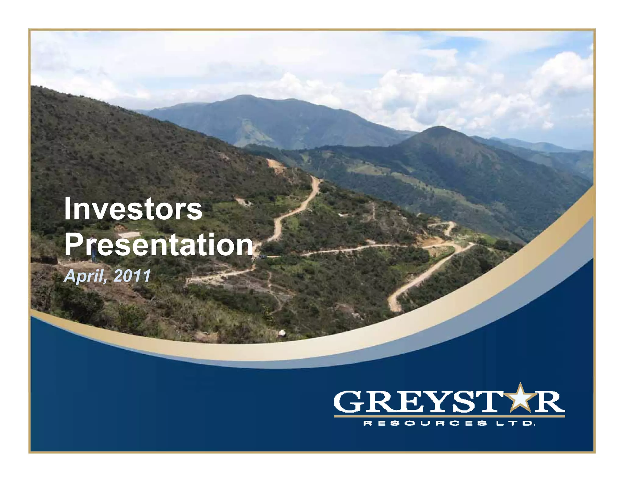 This presentation provides an overview of Greystar Resources and its Angostura gold/silver project in Colombia. Greystar is focused on exploring and developing the Angostura project, which has an initial underground resource estimate of 2.4 million ounces of gold and 13.4 million ounces of silver. The presentation discusses Greystar's strong financial position with no debt and $98 million in cash as of December 2010. It also notes that permitting applications for an open pit/heap leach project were suspended due to environmental concerns and the company is now evaluating an underground mining project and examining other development alternatives for the Angostura project.