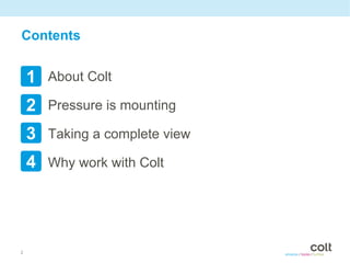 Colt is a European provider of networking and IT infrastructure services that sees pressure mounting on businesses to adapt quickly to changing technology and market demands. It takes a complete view of customer needs by integrating its networks, IT infrastructure, and expertise to deliver a powerful information delivery platform for European businesses. This platform allows customers to depend on Colt to provide innovative solutions that help reduce costs, accelerate speed to market, and make assets work harder through services ranging from traditional IT to cloud computing.
