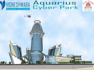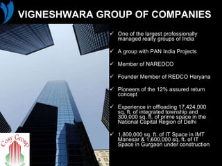This document provides information about Vigneshwara Group of Companies, a major real estate developer in India. It summarizes the group's accomplished and ongoing projects, which include large integrated townships and IT parks across several states. It then describes the Aquarius Cyber Park project in Gurgaon and provides details on investment options like the assured return plan and buyback plan. Floor plans and rates are listed, along with notable clients and media partners for the project.
