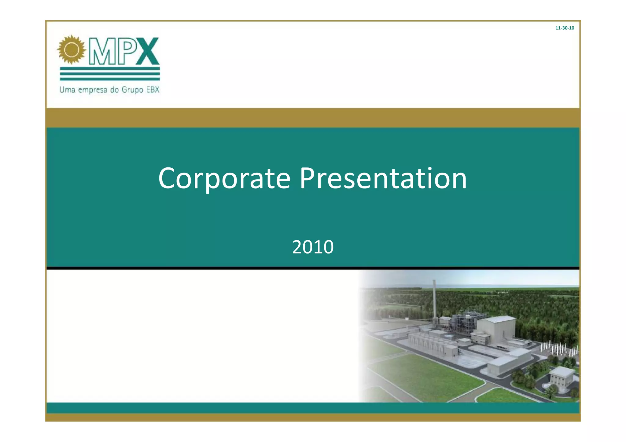 The document is a 2010 corporate presentation by MPX Energia S.A. It begins with disclaimer notes about forward-looking statements and reliance on information. The presentation then provides an overview of MPX as a diversified private utility with coal and natural gas assets in Colombia and Brazil. It notes MPX has flexibility to supply resources to its own plants or international markets. Charts show Brazil's increasing power demand driven by economic growth and how new hydro plants have limited storage capacity, increasing reliance on thermal generation.
