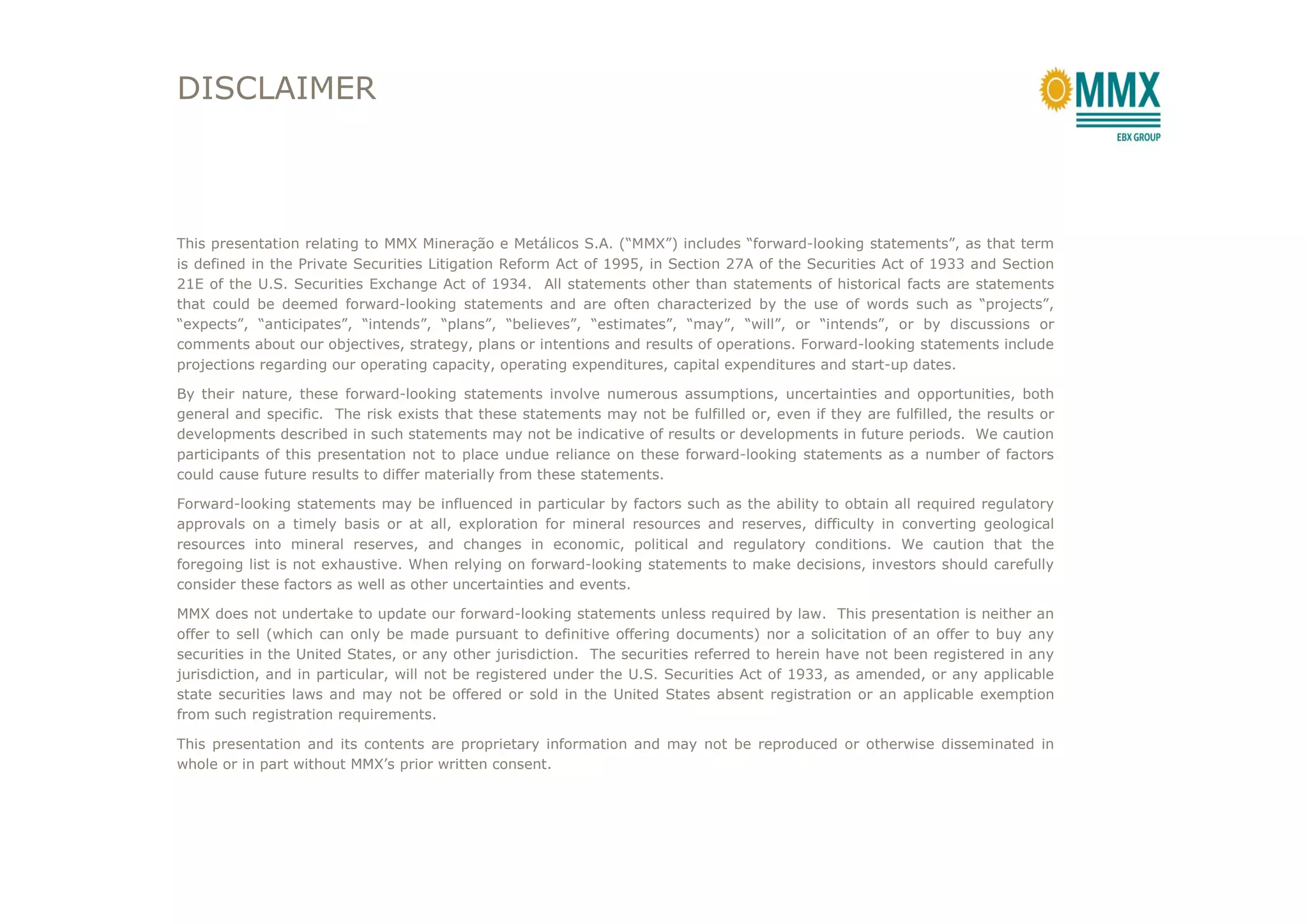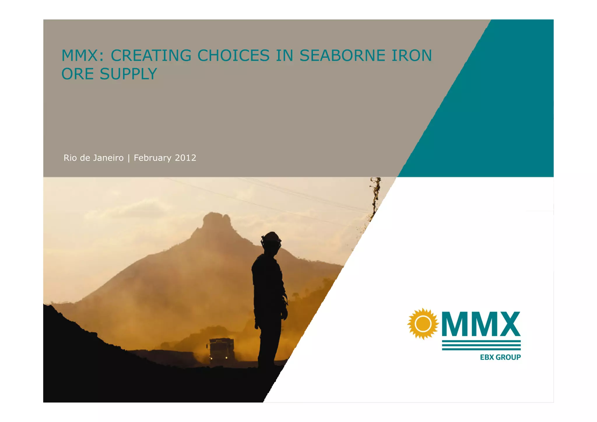 MMX is a Brazilian iron ore mining company that is developing integrated iron ore supply systems in Brazil and Chile to supply the global seaborne market. The company's key assets include the Serra Azul mine and expansion project in Brazil, the Sudeste Superport, and iron ore exploration properties in Chile. MMX aims to have an annual production capacity of over 50 million metric tons per year through these assets and long-term supply contracts with major customers like China and South Korea.