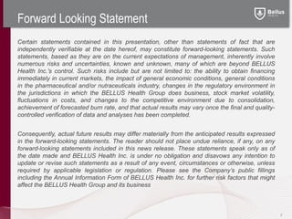 This corporate presentation by Roberto Bellini, President and CEO of BELLUS Health Inc., provides an overview of the company and its pipeline. BELLUS is focused on developing products for amyloid-related diseases, including its lead product KIACTA for AA amyloidosis, an orphan kidney disease with no approved treatments. The presentation summarizes the positive Phase II/III results for KIACTA and outlines plans to conduct a Phase III confirmatory trial to obtain marketing approval. In addition, it describes BELLUS' nutraceutical product VIVIMIND and its Alzheimer's drug candidate BLU8499. Near-term milestones include completing enrollment in the KIACTA Phase III trial and advancing
