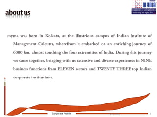 myma was founded in Kolkata, India and has experience in business functions and sectors across India. Its mission is to help businesses become sustainably profitable. Its vision is to be the most preferred partner for businesses, employees, and stakeholders. myma's core values include ethical behavior, individual empowerment, and collective responsibility. It aims to ensure clients are satisfied and receive a fair price.