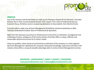 Promobiz is an event management company with branches across Gujarat. It offers a wide range of event management and exhibition solutions through a talented team of professionals. Promobiz prides itself on its customer focus, professional service, perfection, and dedication, which allow it to effectively meet client needs regardless of the size or industry. It has extensive experience and industry connections that provide unique advantages for event management.