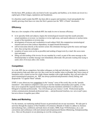 RPL is a translation company that provides accurate translations between English and French. Their mission is to translate documents in technical, commercial, and other fields with a focus on information technology, automotive, training, and other industries. RPL aims to produce flawless, high-quality translations using best practices such as thorough terminology research and self-revision. They strive for 100% client satisfaction and have maintained a loyal client base. RPL works efficiently using methods like computerized terminology databases and electronic document sharing. They turn down work only if they cannot guarantee quality due to being overloaded. RPL aims to improve customer service systems and broaden their client base, especially in information technology.