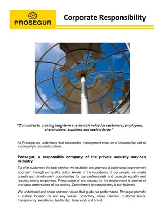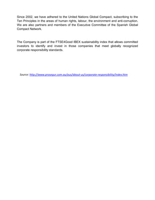 Prosegur is committed to creating long-term sustainable value for various stakeholders through responsible management and a continuous improvement approach in its private security services. The company emphasizes employee growth, equality, environmental preservation, and transparency, aligning with key values such as proactivity and customer focus. Prosegur is a participant in the United Nations Global Compact and is part of the FTSE4Good IBEX sustainability index, demonstrating its commitment to corporate responsibility and recognized standards.