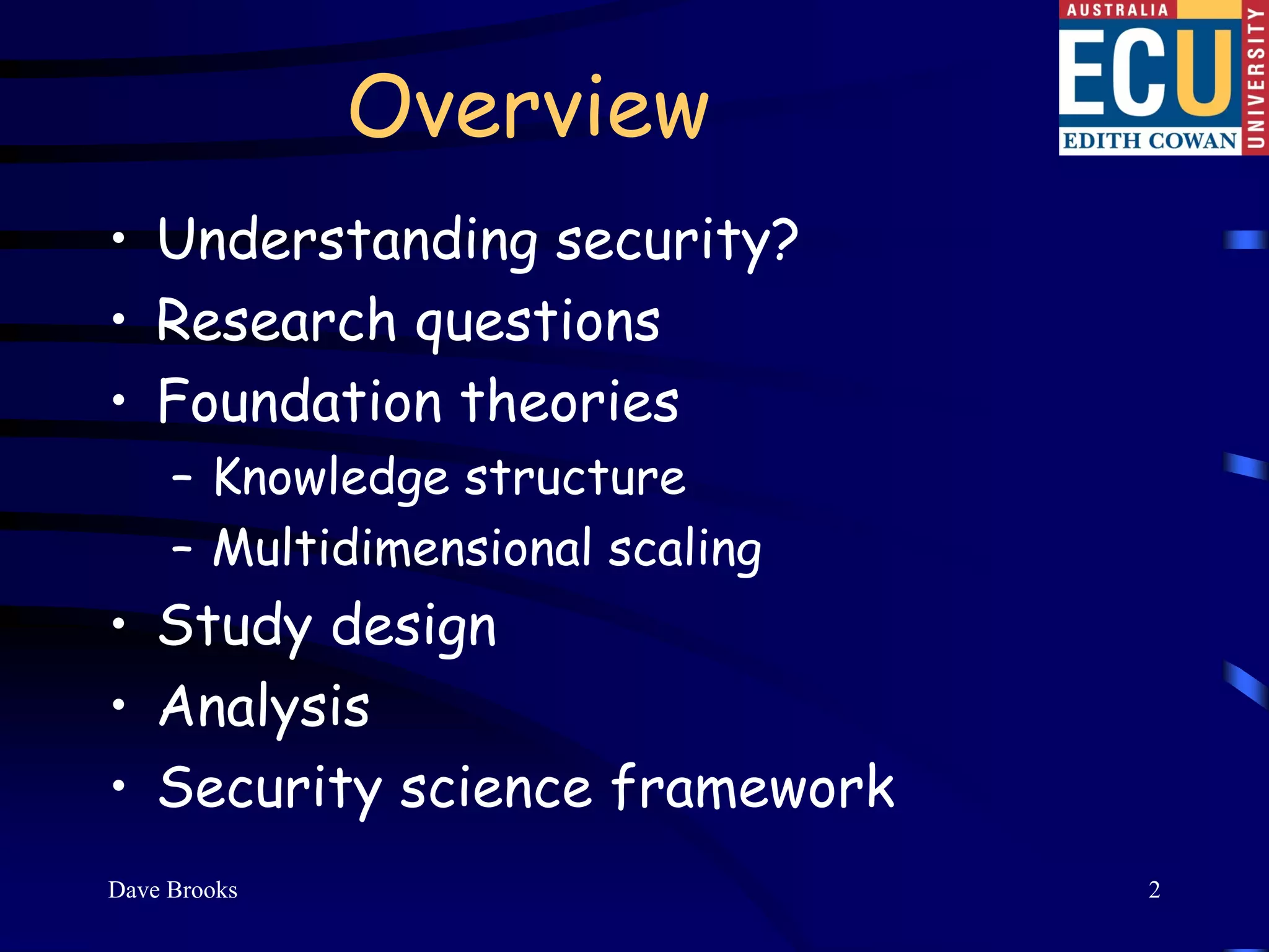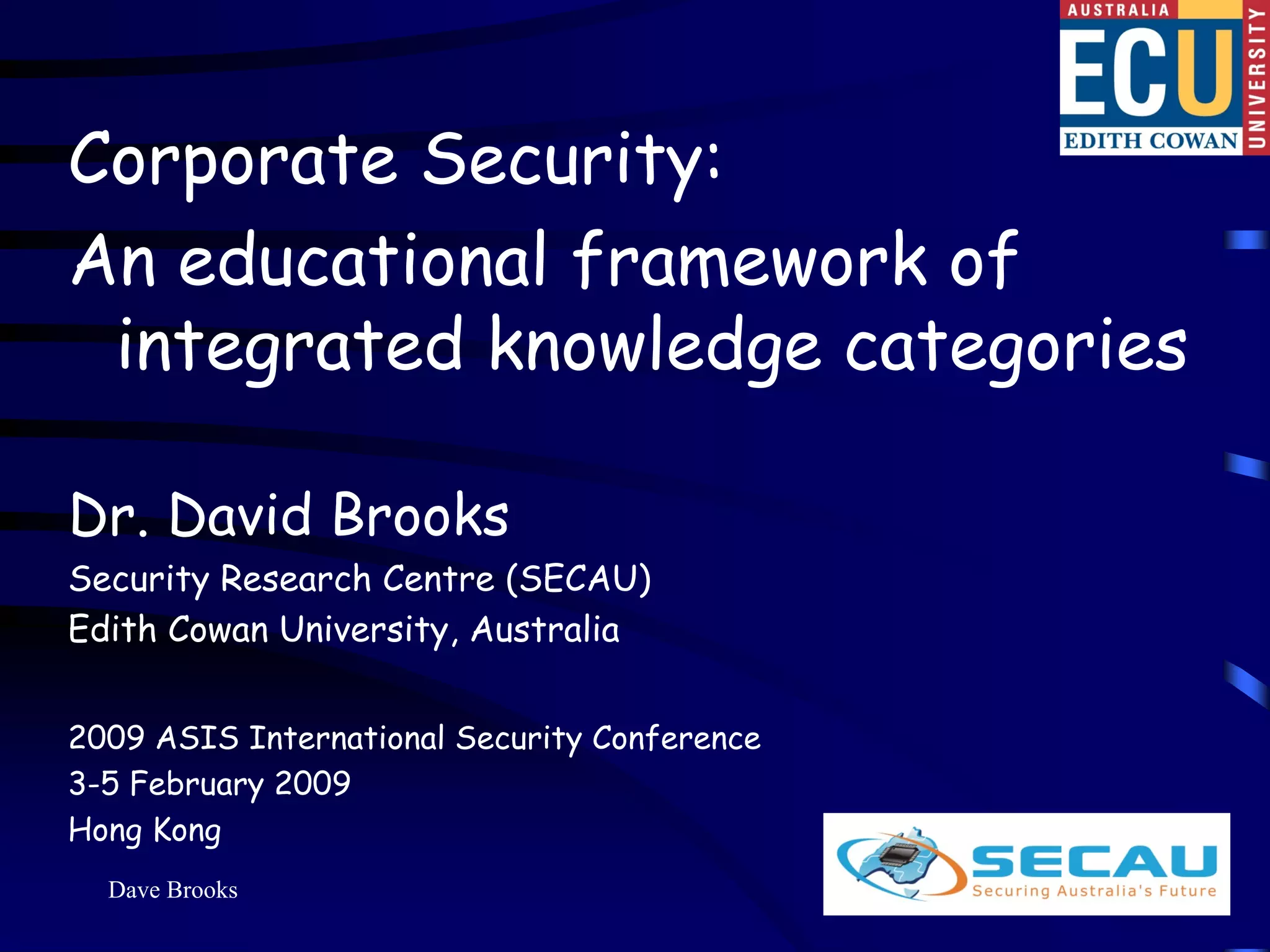 This document summarizes Dr. David Brooks' presentation at the 2009 ASIS International Security Conference in Hong Kong. The presentation developed an educational framework of integrated security knowledge categories through analyzing over 100 tertiary security courses. Key findings included identifying common security categories and developing a science of security framework through multidimensional scaling of experts' knowledge ratings. The framework aims to develop a consensus on the body of knowledge for corporate security.