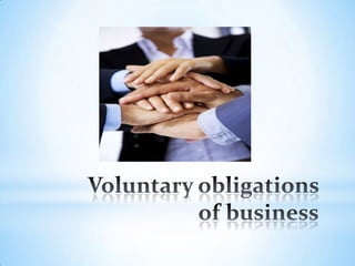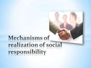 Corporate social responsibility (CSR) involves self-regulation by businesses to integrate social and environmental concerns into their operations and interactions with stakeholders. CSR participants include owners, shareholders, and local governments. CSR aims to balance economic, ecological, and social impacts as a way to profit businesses, compensate for state inefficiencies, and remedy violations of natural rights through continuous reputation-building activities. Businesses take different approaches to organizing CSR such as independent programs, own funds, or solutions developed through collaboration.