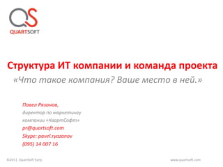 Документ представляет собой описание структуры IT-компании Quartsoft и команды проекта, акцентируя внимание на роли каждого участника, необходимых навыках и бонусах, связанных с работой в различных ролях. Цели компании включают развитие IT в регионе, а также обеспечение стабильной и интересной работы для сотрудников. Также обсуждаются мифы о больших компаниях и открытые вакансии.