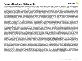 The document provides an update on Agnico Eagle Mines for August 2016. It includes forward-looking statements and notes of caution regarding the use of non-GAAP measures in financial presentations. The update discusses Agnico Eagle's consistent strategy of production growth, high quality gold reserves with above peer average grades, strong balance sheet, and exploration as a value driver. It also provides highlights on recent operational and financial results and production guidance into 2019 and beyond.