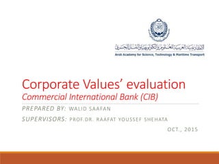 The document evaluates the corporate values of Commercial International Bank (CIB) and their impact on organizational growth and performance. Established in 1975, CIB aims to uphold a distinct reputation in Egypt's financial sector through integrity, client focus, innovation, hard work, teamwork, and respect for individuals. The evaluation examines the effectiveness of these values in achieving the company's mission and aligning with stakeholder interests.