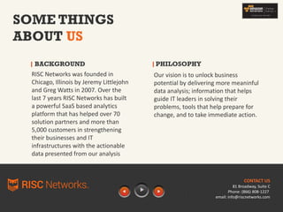 RISC Networks provides a software-as-a-service analytics platform that helps customers analyze their IT infrastructure and cloud environments. The platform offers modules for IT health checks, cloud assessments, workload migrations, and application dependency mapping. RISC Networks' analytics have helped over 5,000 customers and its partnerships with 70 solution providers have fueled the company's growth since it was founded in 2007.
