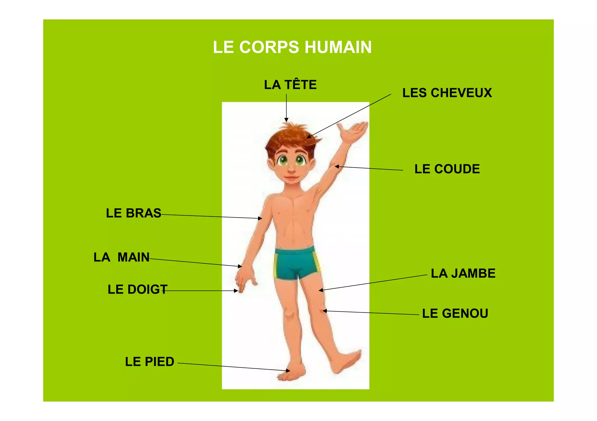 LA TÊTE LES CHEVEUX LE COUDE LE BRAS LA MAIN LA JAMBE LE DOIGT LE GENOU LE PIED