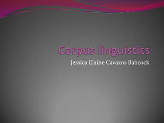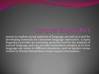 Corpus linguistics refers to large collections of natural language texts that can be analyzed using computational techniques. Creating corpora involves collecting and transcribing written or spoken texts, which is time-consuming. Well known corpora include the British National Corpus and the Lancaster-Oslo-Bergen Corpus. There are different types of corpora depending on the research questions or topics being investigated. Analyzing corpora can provide insights into patterns of language use across different text types and contexts. Teachers and material developers can use corpus analyses to inform instruction and claims about linguistic features.