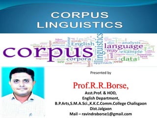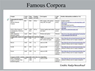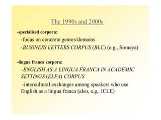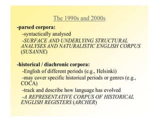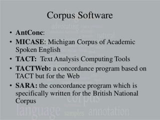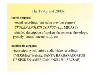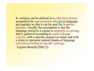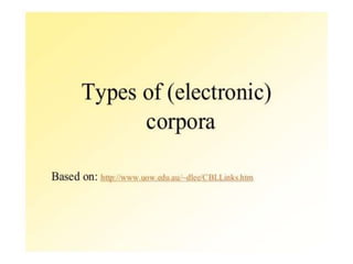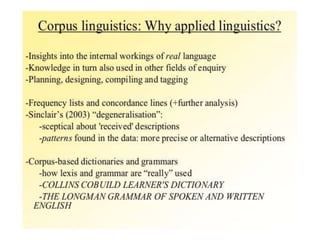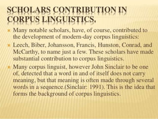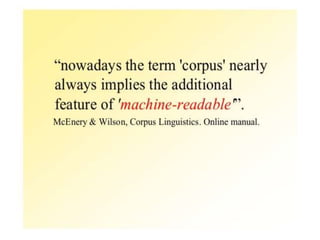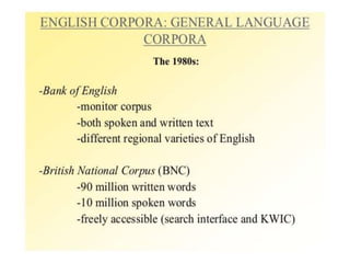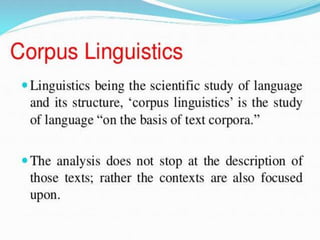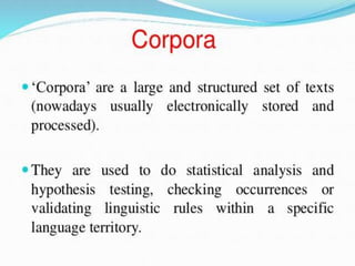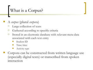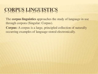Corpus linguistics is the study of language based on large collections of real-world language samples stored in computer databases called corpora. Corpora allow for the reliable, accurate, and replicable analysis of language at a large scale and in ways not previously possible. A corpus is a collection of written or spoken language samples chosen to represent a variety of language. Corpus linguistics uses computer analysis of corpora to provide insights into language usage patterns based on frequency of phenomena in authentic texts. Key corpora include the British National Corpus and International Corpus of English.