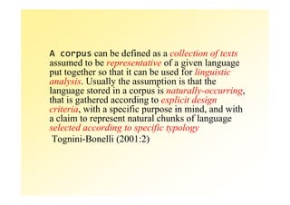 Corpus linguistics involves the collection and analysis of large bodies of text, known as corpora. It uses empirical methods to discover patterns of language use by examining naturally occurring texts. Key aspects of corpus linguistics include using large, representative text samples; analyzing frequency, collocation, and concordance; and applying findings to fields like lexicography, language teaching, and theoretical linguistics. Corpus analysis tools allow researchers to investigate features of syntax, semantics, and pragmatics that traditional intuition-based methods cannot.