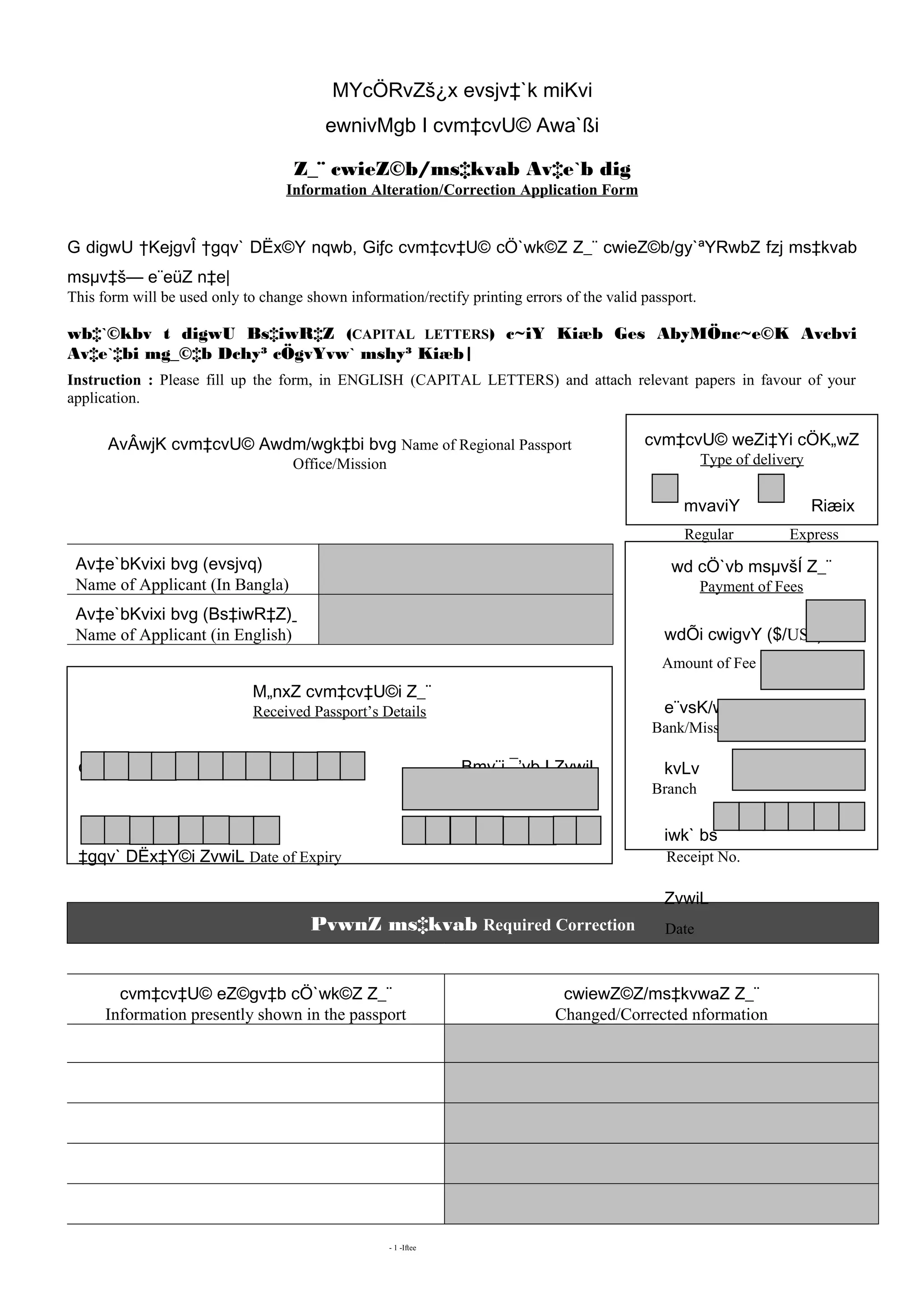 This document is an application form for altering or correcting information in a valid Bangladeshi passport. The form must be filled out in capital English letters and relevant documents must be attached to support the application. It requests information such as the applicant's name, passport details, required correction, and payment details. Signatures of the applicant and official are needed, as well as enclosures to support the requested change.
