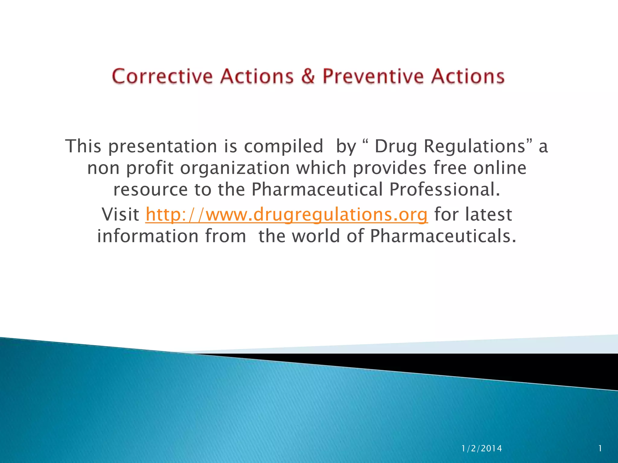 The presentation highlights the role of the non-profit organization 'Drug Regulations' in providing pharmaceutical professionals with resources on corrective and preventive actions (CAPA) for quality management in manufacturing. It emphasizes the need for systematic investigation of non-conformities, the effective implementation of CAPA, and regular reviews to ensure compliance with regulatory standards. Additionally, it points out the importance of root cause analysis and risk assessment in addressing quality issues and improving overall processes.