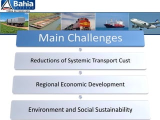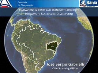 This document discusses innovations in trade and transport corridors as pathways to sustainable development in Brazil. It outlines plans to develop a comprehensive corridor management system based on a well-coordinated, prioritized, and phased action plan. This includes integrating the San Francisco River with Northeast hydrographic basins through projects like expanding the São Francisco River waterway and building the FIOL railway. The goal is to improve economic infrastructure through investments in water, rail, and road projects to transport goods like grains, fruits, minerals, and pulp to industrial centers and ports.