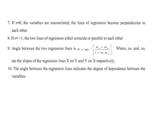 This document discusses correlation and regression analysis. It defines correlation as a measure of the linear relationship between two variables and notes its uses in various fields. Simple linear regression fits a linear equation to describe the relationship between a dependent variable (Y) and independent variable (X). Key points covered include: