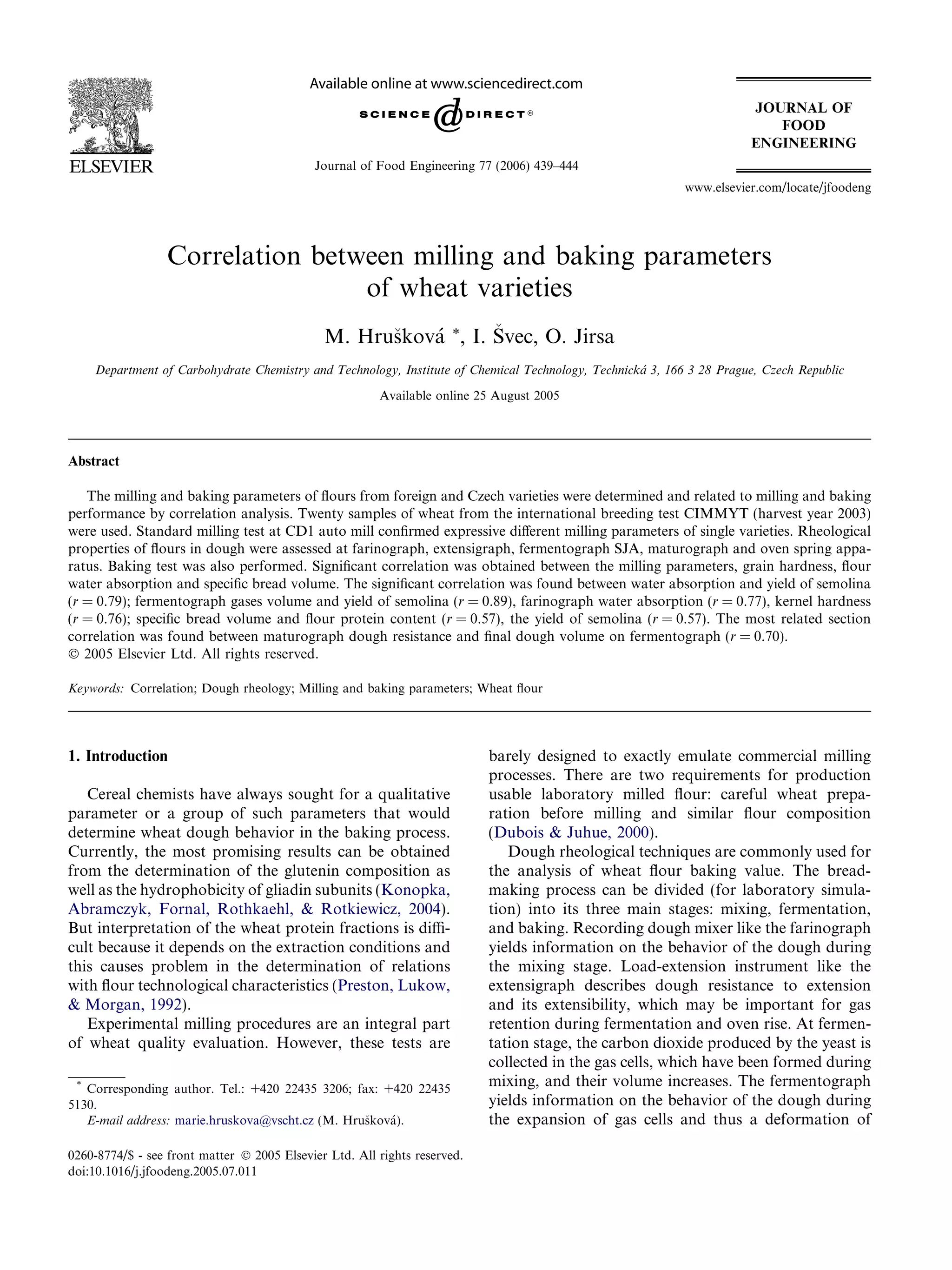 This document analyzes the correlation between milling and baking parameters of flours from 20 wheat varieties. Standard milling tests showed significant differences in milling parameters between varieties. Rheological dough tests including farinograph, extensigraph, fermentograph, maturograph, and oven spring apparatus assessed properties related to mixing, fermentation, and baking. Significant correlations were found between milling parameters like semolina yield and flour properties like water absorption, gas volume, and bread volume. Varieties with higher semolina yields tended to have higher water absorption, gas volume, and specific bread volume. The study identified relationships between wheat and flour properties and their influence on milling and baking performance.