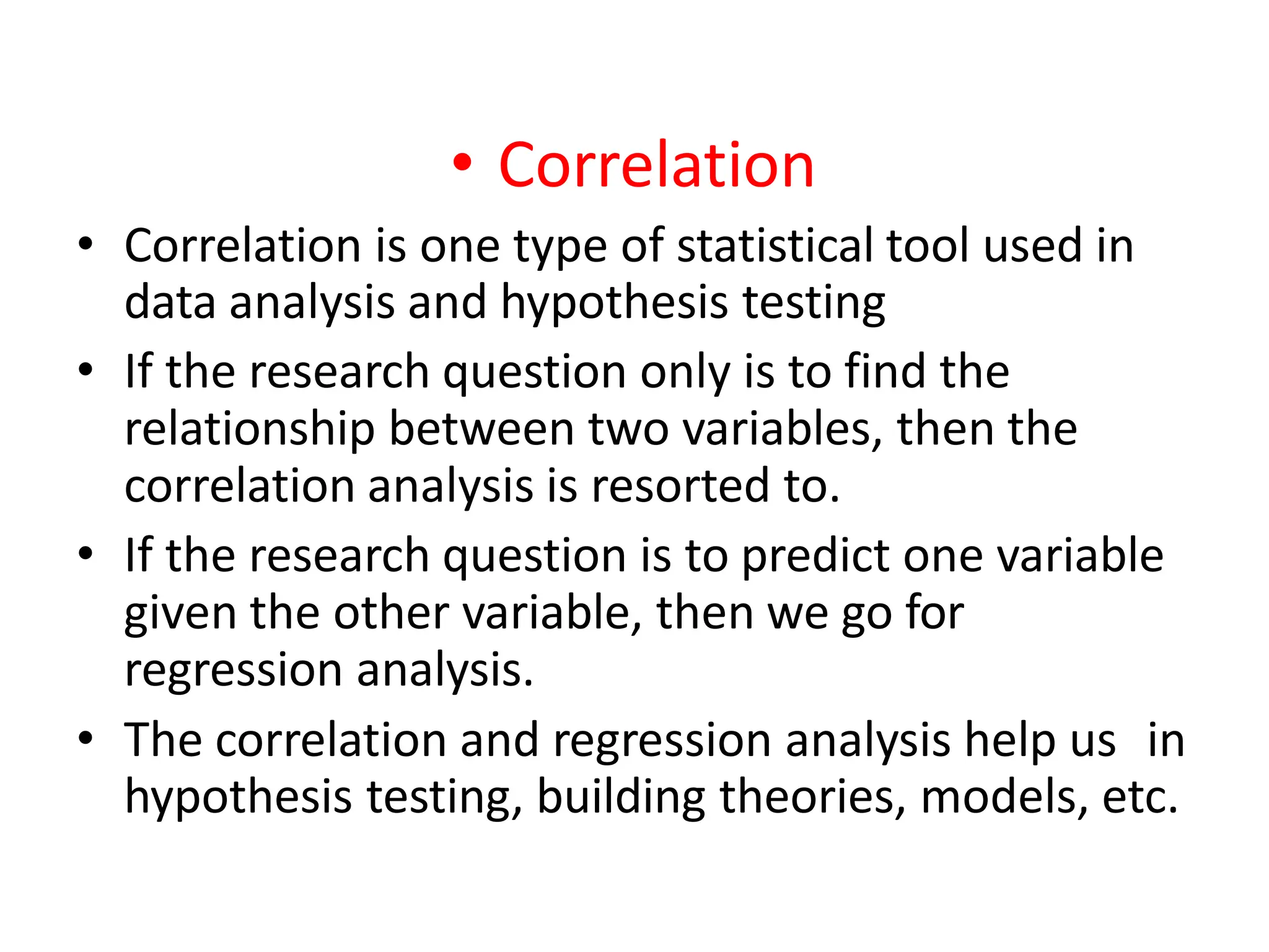 This document discusses correlation and related statistical concepts. Correlation measures the strength and direction of association between two quantitative variables. A correlation of 0 means no association, 1 means perfect positive association, and -1 means perfect negative association. Correlation is independent of measurement units and scaling of variables. Hypothesis testing is used to make inferences about the population correlation based on a sample correlation. The null hypothesis is that the population correlation is 0, and alternative hypotheses specify a non-zero correlation. The test statistic used is Student's t distribution. The null is rejected if the calculated t exceeds the critical value or if the p-value is less than the significance level.