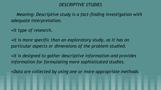 The document discusses descriptive and correlation studies in research methodology, emphasizing that descriptive studies gather information to identify characteristics without testing hypotheses. Correlation analysis measures the relationship between variables, with various types such as positive, negative, simple, partial, and multiple correlations. It describes methods for studying correlation, their merits and demerits, and highlights the significance of understanding these relationships in practical applications.