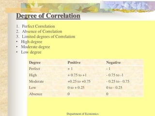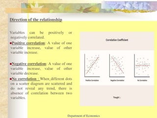 Positive correlations exist between taller people and larger shoe sizes, more savings and greater financial security, and higher temperatures and increased ice cream sales. Negative correlations are seen between more absences and lower grades, colder weather and decreased air conditioning costs, and slower speeds and increased travel time. An example analyzes the highway accident relationship between motor speed and number of accidents, finding that increased speed correlates with more accidents, demonstrating how a correlation chart depicts the connection between variables.