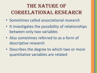 Correlational research investigates relationships between two variables without manipulating either variable. It can be used for explanatory purposes to help explain behaviors, or for prediction purposes to predict outcomes. Common correlational techniques include scatter plots, regression analysis, multiple regression, and factor analysis. Threats to internal validity like subject characteristics, location, instrumentation, and mortality must be evaluated. The basic steps in correlational research are problem selection, sampling, instrumentation, design, data collection, and evaluating threats to validity.