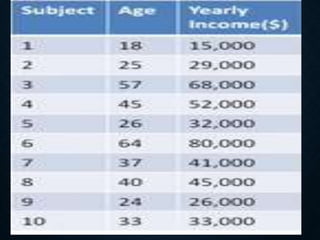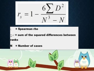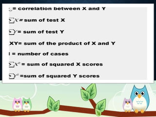 Correlation analysis is used to determine the relationship between two or more variables. It can analyze the degree, direction, and type of relationship. The key types of correlation are positive (variables increase together), negative (variables change inversely), simple (two variables), partial (three+ variables with some held constant), and multiple (three+ variables together). Correlation can also be linear (constant ratio of changes) or non-linear (varying ratio of changes). It is useful for understanding variable behavior, estimating values, and interpreting results with measures like the correlation coefficient and coefficient of determination.