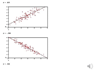 This document discusses correlation and regression analysis. It defines correlation as a statistical measure of how two variables are related or associated. A correlation coefficient between -1 and 1 indicates the strength and direction of the linear relationship between variables. Scatterplots can show these relationships visually. The Pearson correlation coefficient is the most common measure used, where 0 indicates no correlation and 1 or -1 indicates perfect correlation. Correlation only measures linear relationships and does not necessarily imply causation between variables.