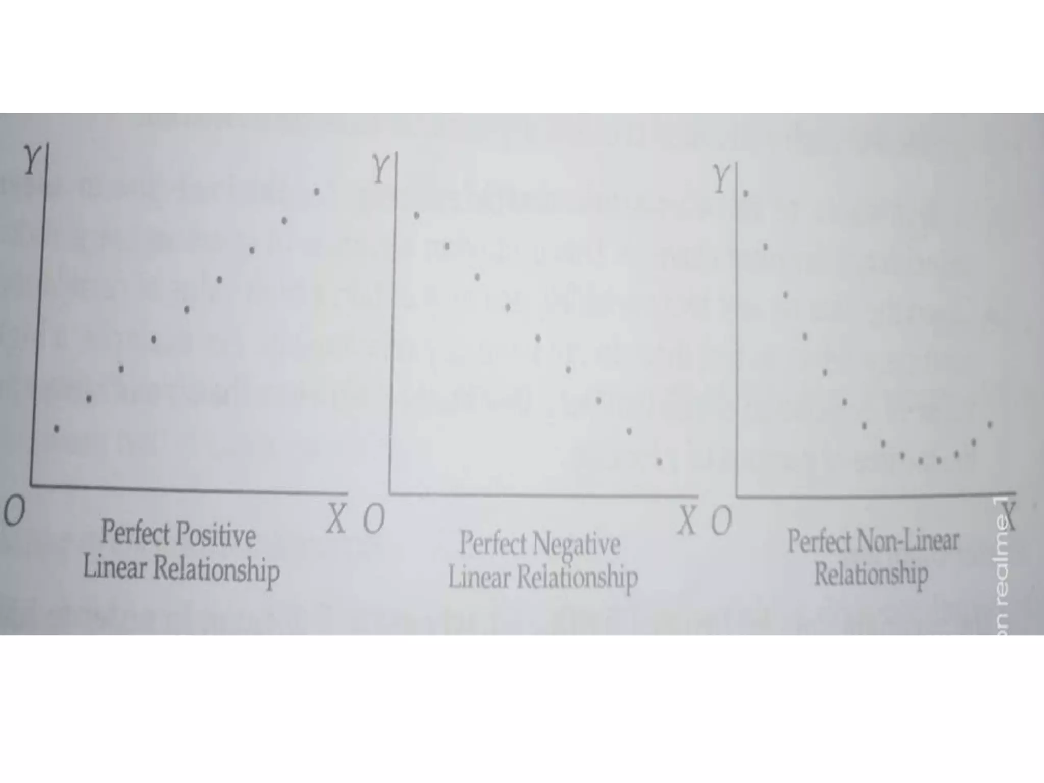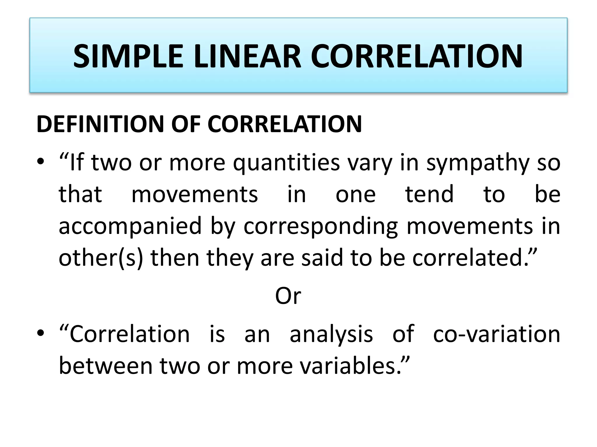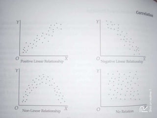 This document discusses simple linear correlation. It defines correlation as the co-variation between two or more variables. The main types of correlation discussed are positive and negative correlation, and linear and non-linear correlation. Positive correlation means that as one variable increases, the other also increases, while negative correlation means one variable increases as the other decreases. Linear correlation means the relationship between the variables is constant, while non-linear means it is not. Methods for studying correlation discussed include scatter diagrams, Pearson's coefficient of correlation, and rank correlation.