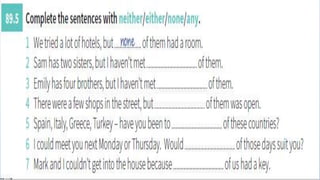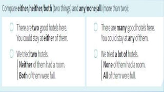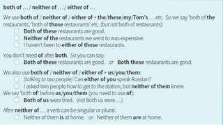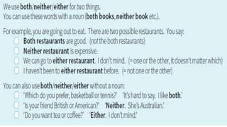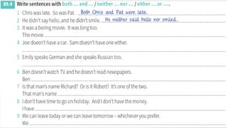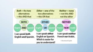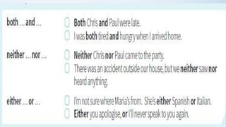 This document discusses correlative conjunctions, including identifying their structure and use and creating sentences using them. It provides examples of sentences using correlative conjunctions such as "both...and", "not only...but also", "either...or", and "neither...nor". It explains that the two elements connected by correlative conjunctions should be balanced and have parallel structure. The document also discusses subject-verb agreement rules for sentences using correlative conjunctions and avoiding double negatives.