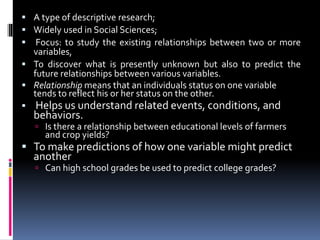 Correlational research examines relationships between two or more variables without manipulating them. It is a type of descriptive research commonly used in social sciences to discover unknown relationships and make predictions. Key aspects include identifying predictor and criterion variables, collecting data from sources like surveys, calculating correlation coefficients like Pearson's r to measure the strength and direction of relationships, and determining if relationships are statistically significant. Correlational research has limitations but allows studying phenomena that can't be experimentally manipulated for practical or ethical reasons.