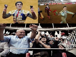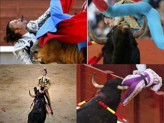 Bullfighting is a traditional Spanish spectacle where a matador fights and kills a bull. The matador uses cape and sword skills to tire and ultimately kill the bull for the entertainment of spectators. The document provides an overview of bullfighting and invites any questions about the tradition from readers.
