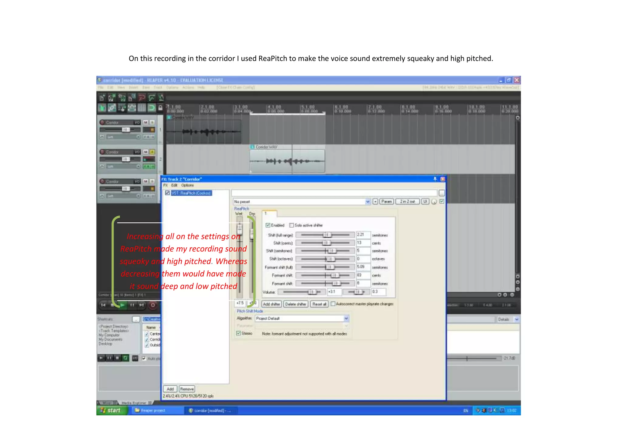 This 3 sentence document discusses using the audio software ReaPitch to modify a voice recording, making the voice sound very squeaky and high pitched by increasing all of ReaPitch's settings, whereas decreasing the settings would have made the voice deep and low pitched.
