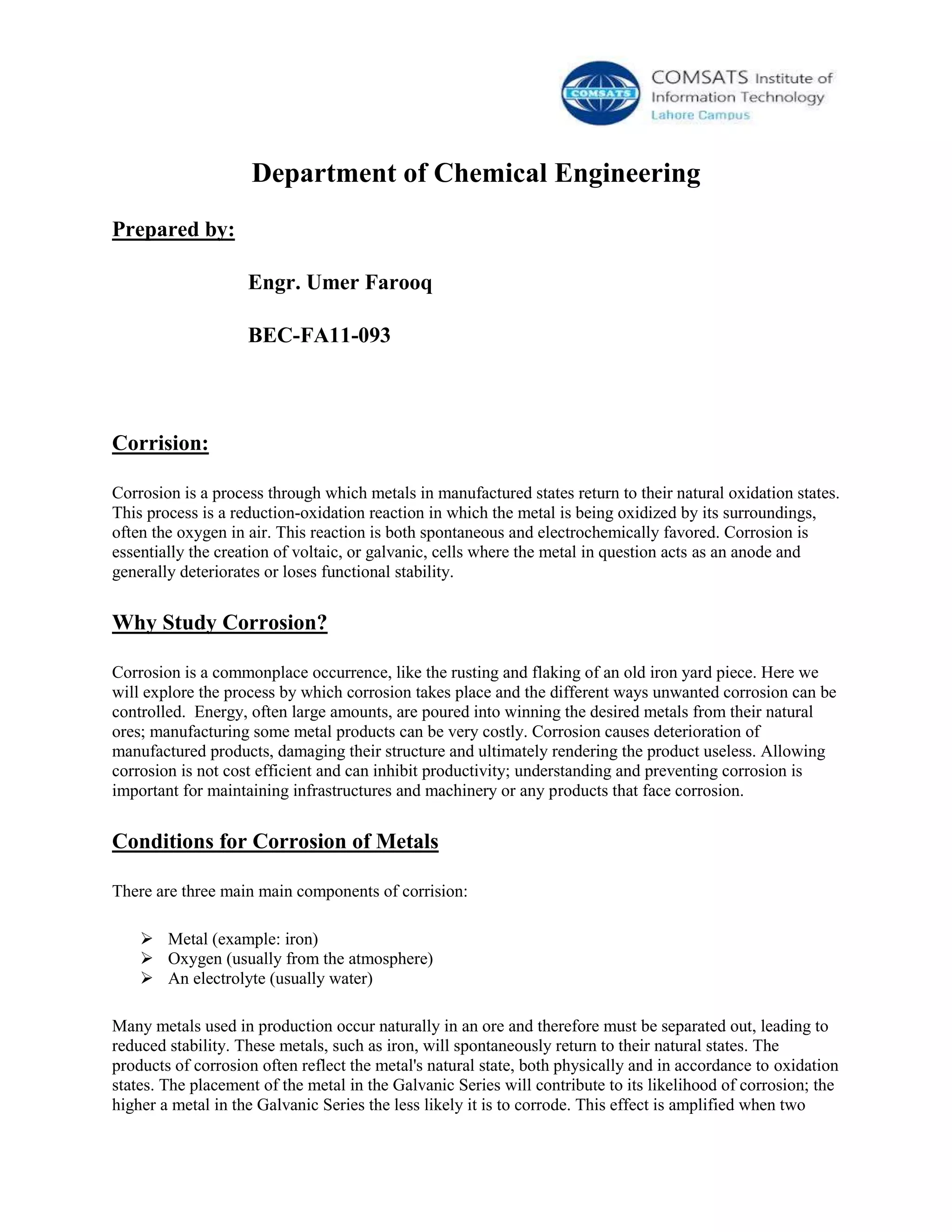 Corrosion is the process by which metals return to their natural oxidation states through redox reactions, often with oxygen. It causes deterioration of metal products and structures. There are three main components required for corrosion: a metal, oxygen, and an electrolyte like water. Corrosion occurs through either generalized thinning of the metal surface or localized pitting. It is an electrochemical process where the metal acts as an anode and is oxidized while oxygen is reduced at the cathode. Corrosion can be prevented using methods like painting, sacrificial anodes, cathodic protection, or exploiting natural corrosion products that form protective barriers.