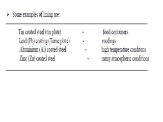 Corrosion is the reaction of a metal with its environment that can cause functional failure. It occurs through electrochemical processes and is influenced by factors like pH, temperature, velocity, and surface films. There are different types of corrosion including general corrosion that uniformly affects a surface, and localized corrosion that occurs at specific sites like pits, cracks, or grain boundaries. Localized corrosion can be influenced by stresses or chemical reactions and causes like galvanic corrosion or stress corrosion cracking. Understanding corrosion mechanisms and influencing factors is important for preventing problems in equipment like reactors, fermenters, and storage containers.
