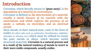 The document discusses corrosion as the degradation of metals due to their reaction with the environment, highlighting its economic impact and various types, including electrochemical, chemical, and stress corrosion. It describes the mechanisms of corrosion and factors influencing its rate, as well as its substantial contribution to economic losses, particularly in India where it accounts for 4.2% of GDP. Additionally, the text covers specialized forms of corrosion such as pitting, galvanic, and stress corrosion cracking, along with preventive measures and the phenomenon of passivity in metals.