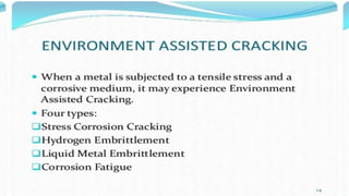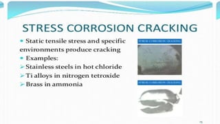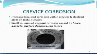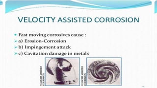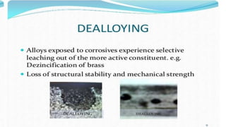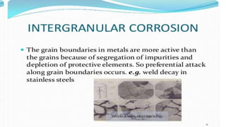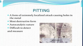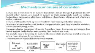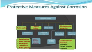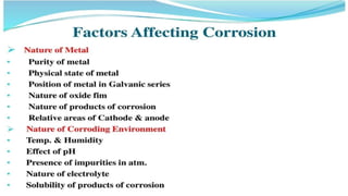 Corrosion is the process by which a metal deteriorates and decomposes due to a chemical reaction with its surrounding environment. There are different types of corrosion that can occur through various mechanisms depending on factors like temperature, moisture, and chemical composition. The document provides an overview of corrosion, its types and mechanisms, factors affecting corrosion, and examples like rusting of iron and the formation of a green film on copper. It concludes by thanking the reader and listing references used.