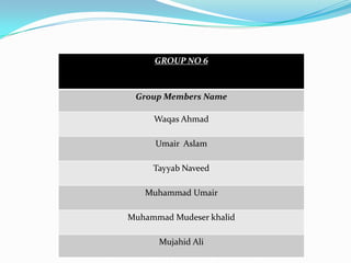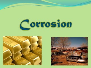 Group 6 presents information on corrosion, including definitions, types of corrosion, factors that affect corrosion rates, and methods for preventing corrosion. The group members are Waqas Ahmad, Umair Aslam, Tayyab Naveed, Muhammad Umair, and Muhammad Mudeser khalid. Corrosion is defined as the decay of metal due to chemical reactions with gases in the atmosphere. There are two main types of corrosion: dry corrosion caused by direct chemical reactions, and wet corrosion which is an electrochemical process. Factors that influence corrosion rates include the metal's position in the galvanic series, purity, physical state, and properties of the corrodent environment. Prevention methods consist of modifying