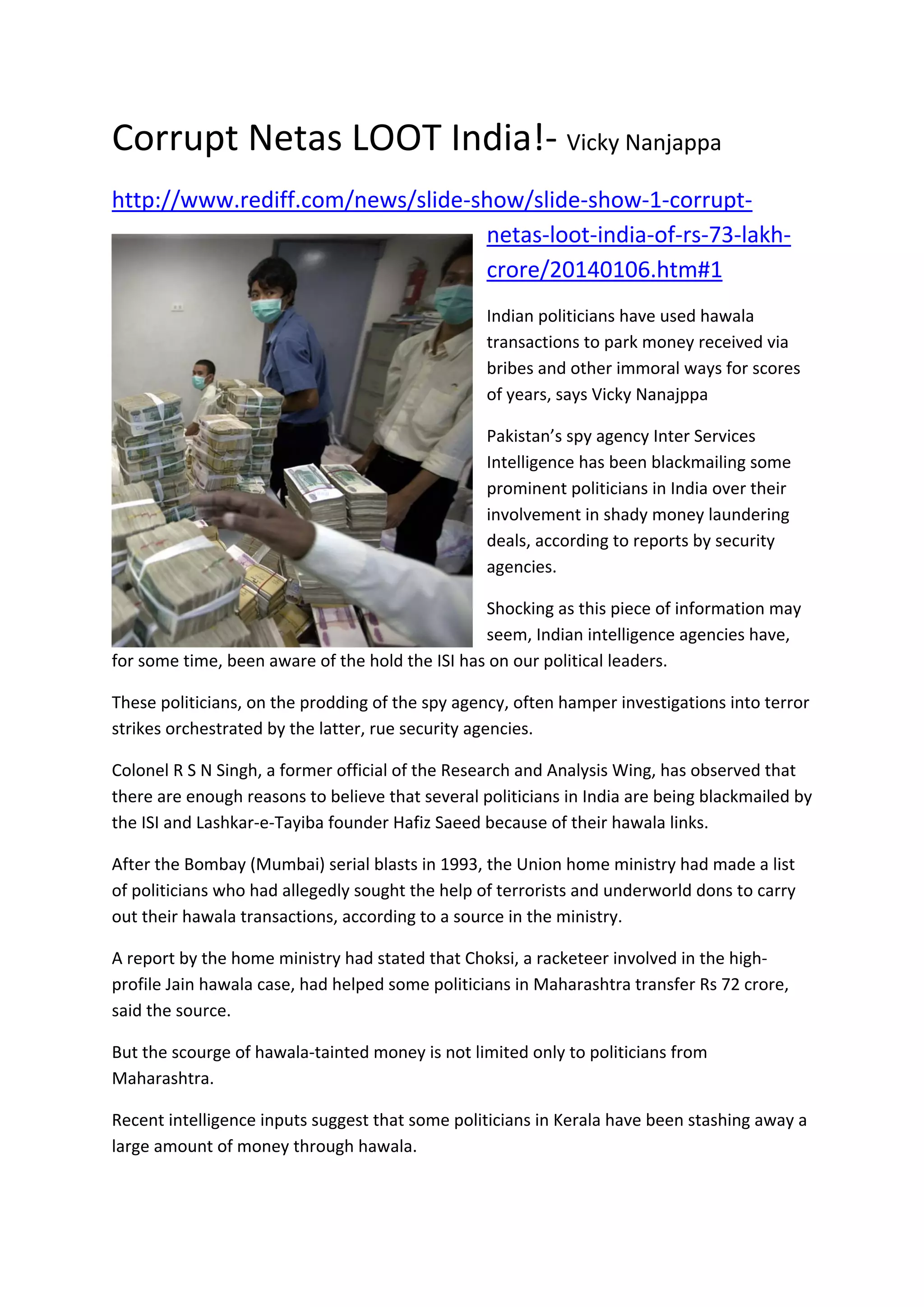 Indian politicians have allegedly engaged in corrupt hawala transactions involving bribes and money laundering, with insights from former intelligence officials suggesting connections with Pakistan's ISI. Reports indicate that these politicians are manipulated by the ISI, which uses blackmail to influence investigations into terror activities. Over the last 25 years, an estimated Rs 73 lakh crore has been siphoned off through such illicit financial activities.