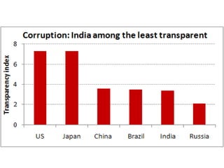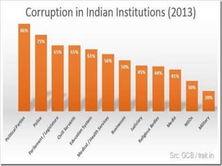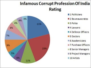 Corruption is defined as illegal acts like bribery and lies that benefit oneself. It has existed throughout history in India, seen during Mughal and British rule and in many post-independence scams. Corruption paralyzes India's economic growth by siphoning public funds meant for infrastructure into private pockets. It causes issues like loss to taxpayers, inflation, and lack of development. While laws and oversight bodies aim to control it, citizens must also refuse bribes and work towards permanent solutions like punishing the corrupt and reforming politics and administration. Corruption continues to seriously degrade India's economy unless strong steps are taken by the judiciary and government.