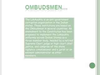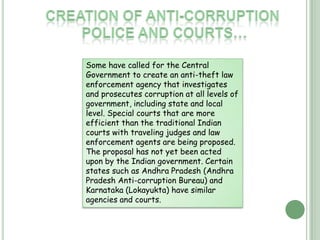 This document discusses corruption in India, including its causes and potential remedies. It notes that corruption exists across many sections of Indian society and government, including the political system, bureaucracy, police, armed forces, judiciary, and religious institutions. Common forms of corruption include bribery, misuse of public funds and resources, and the criminalization of politics. Suggested remedies include strengthening anti-corruption laws and whistleblower protections, computerizing government services, and establishing independent anti-corruption organizations and courts.