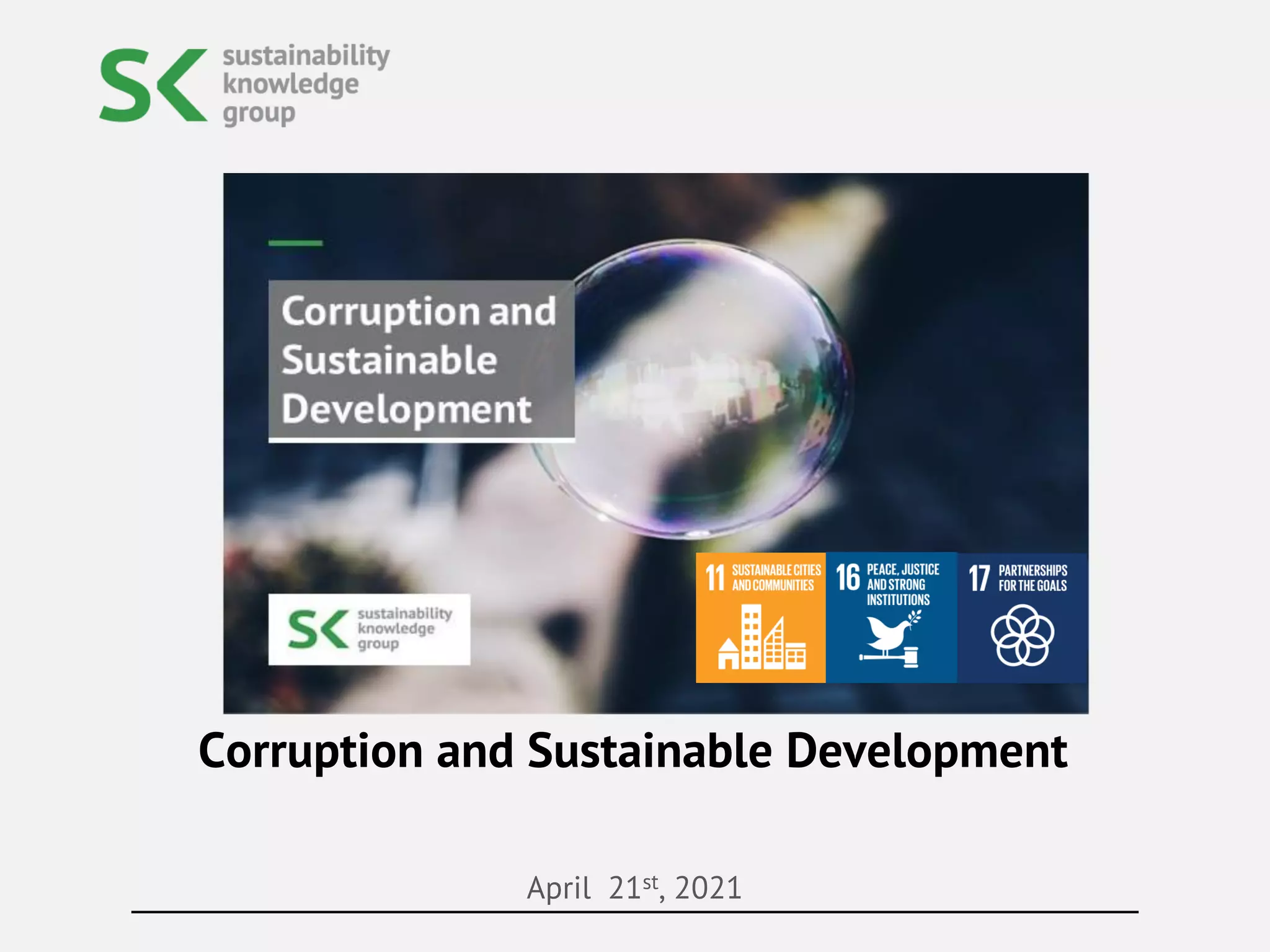 This document provides information about Sustainability Knowledge Group, a global advisory firm focused on creating value through CSR and sustainability solutions. It discusses their vision, services, clients, and presence in different regions. It also summarizes a report on corruption and sustainable development, including key findings from the 2020 Corruption Perceptions Index and recommendations to curb corruption from Transparency International.