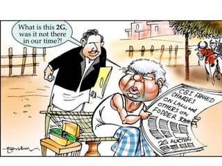 Corruption is widespread in India and negatively impacts politics, government administration, and the judiciary. In politics, nearly a fourth of Indian parliament members face criminal charges. Government officials often steal public funds and resources, and corruption in hospitals inhibits access to medicines and doctors. The judicial system also suffers from delays, shortage of judges, and corruption. Several major corruption scandals have involved politicians mishandling public funds and assets for personal gain. Overall, corruption remains entrenched in Indian society.